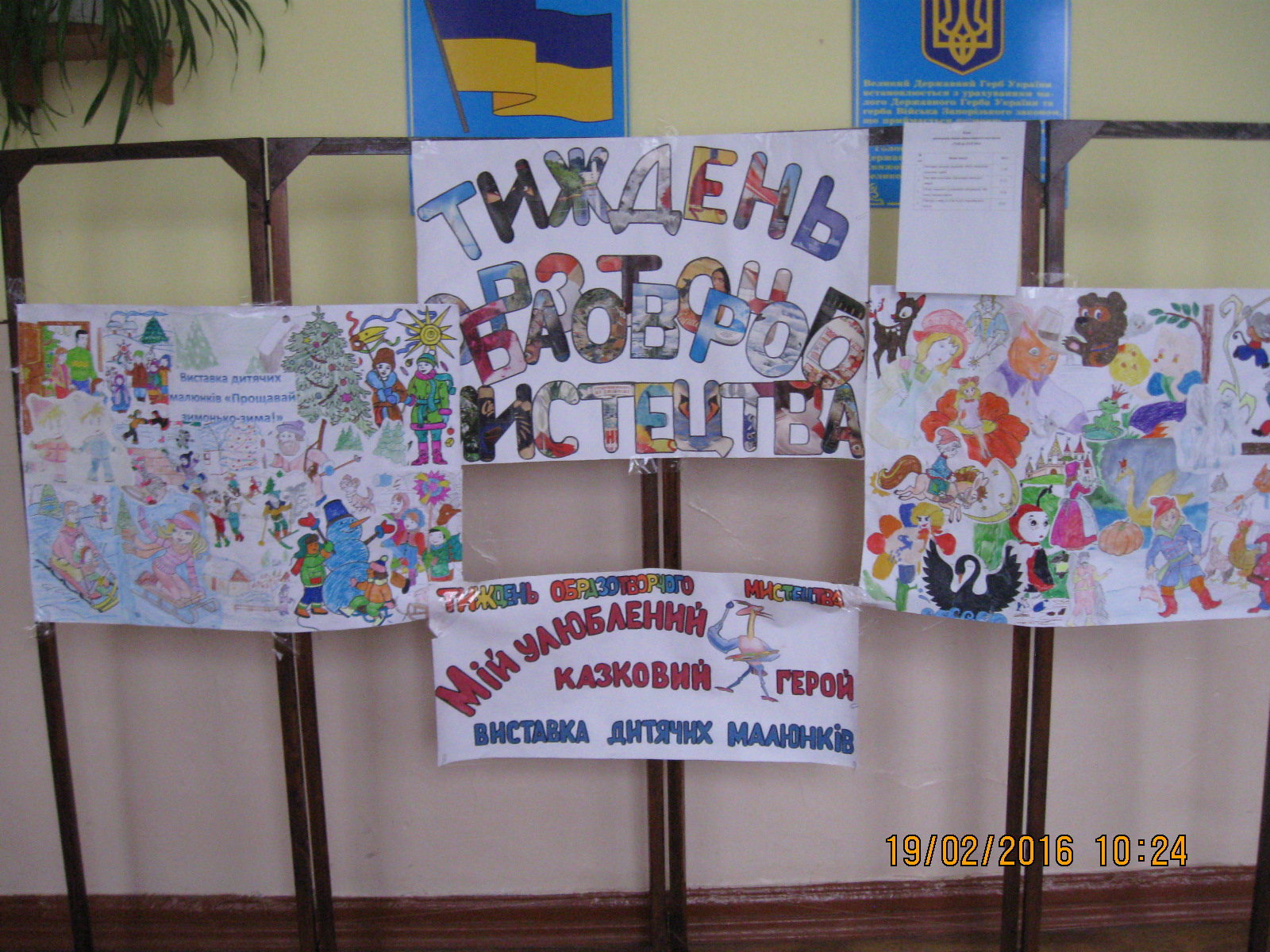 Велику увагу учнів привернули виставки робіт «Прощавай,зимонько-зима» та «Мій улюблений казковий герой». Як підсумок тижня був проведений екскурс в історію «Сім чудес світу» .До цього заходу учні підготували малюнки, прослухали повідомлення вчителя образотворчого мистецтва Тихонової І.Ю. та подивились фільм «Загадки історії». Також учні оглянули виставку юної художниці Лисицької Катерини . Дівчина розповіла про те,як вона малює та де бере натхнення для написання картин.